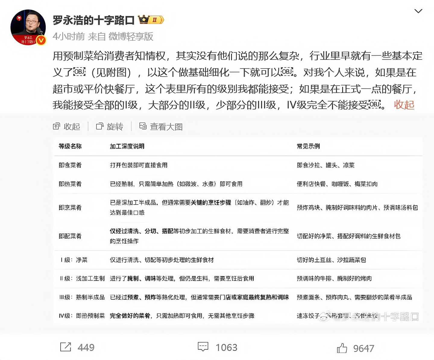 这里的I级指净菜、II级指浅加工生制、III级指熟制半成品、IV级指即热预制菜。